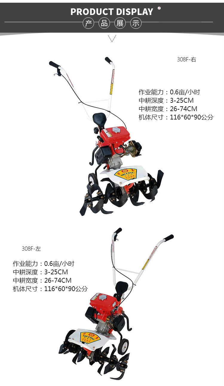 ● 适用于山坡、斜坡、梯田等崎岖地形,中耕松土作业,并可选购开沟培土器而达开沟培土功能